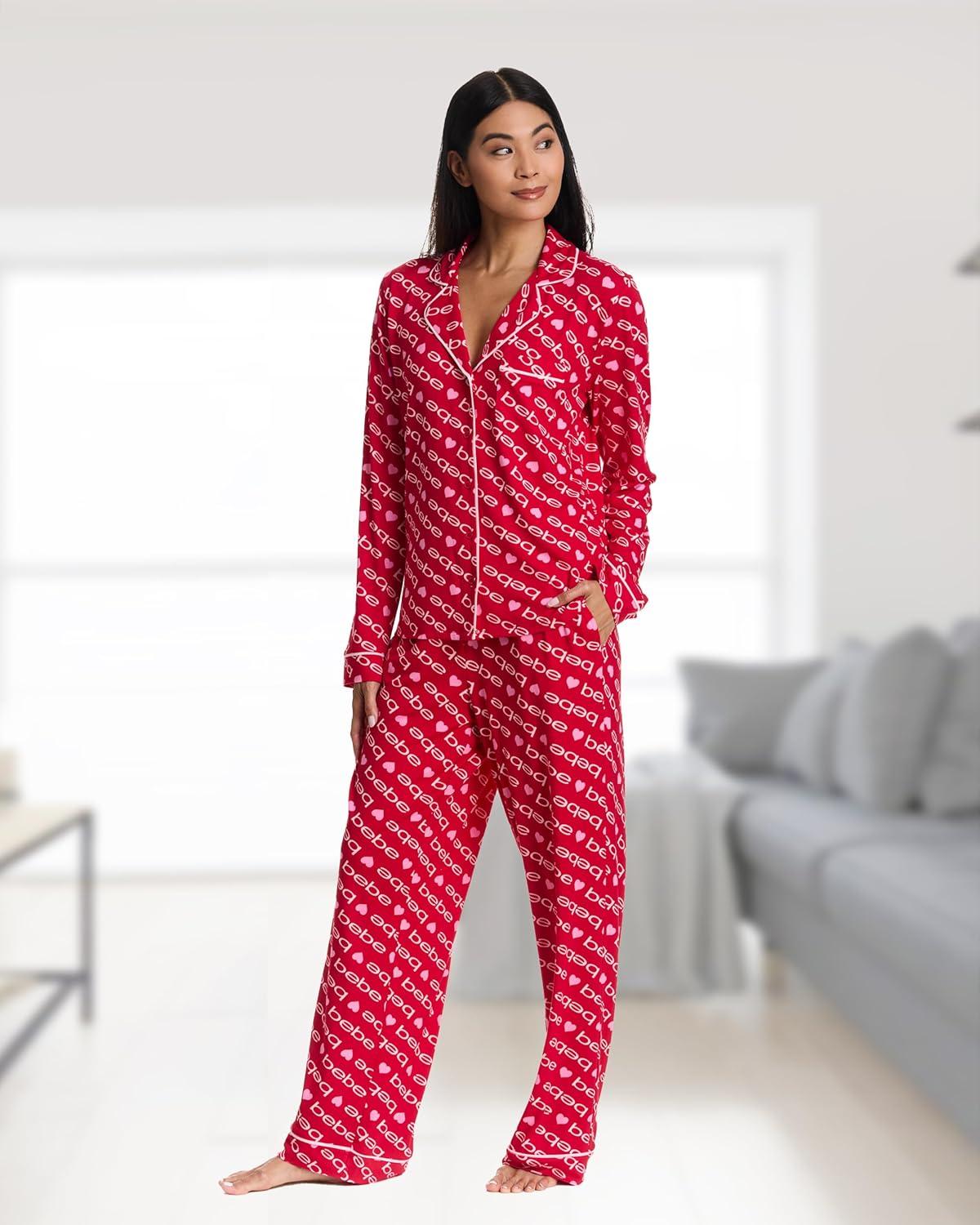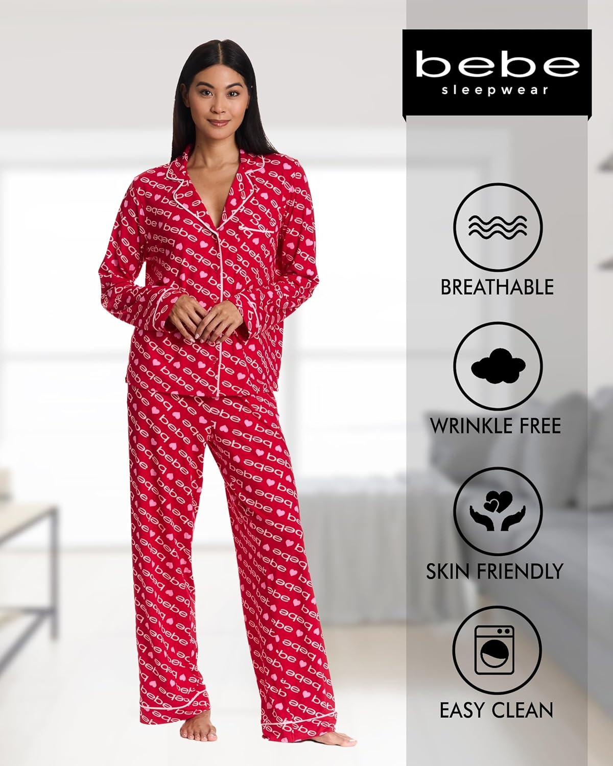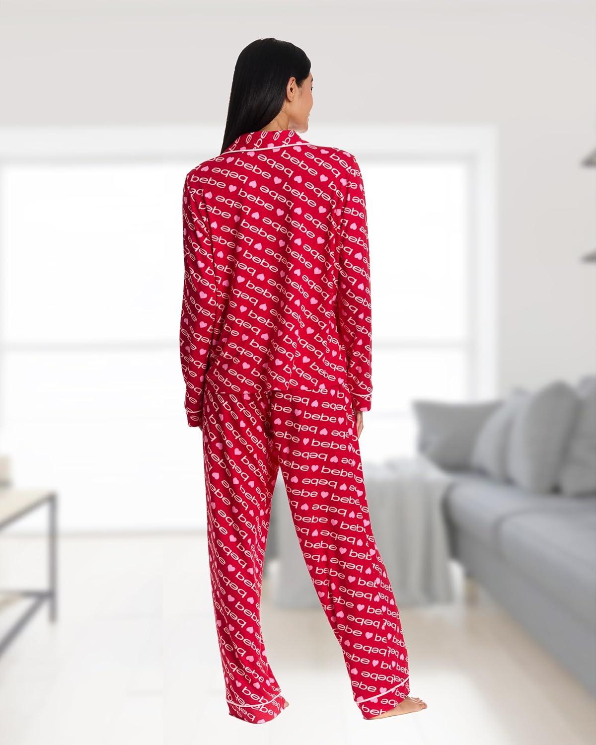 bebe Button Down Pajamas for Women, Long Sleeve Button Up Pajamas with Pants, Ladies Sleepwear PJ Set(Red)