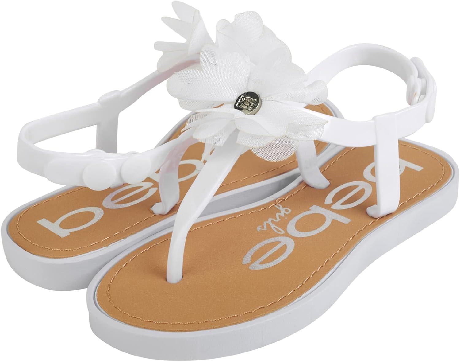 bebe Girls’ Sandals – Open Toe Summer Flat Dress Shoes Snap Buckle Sandals with Chiffon Flower Design and Cushioned Sole(Ivory)