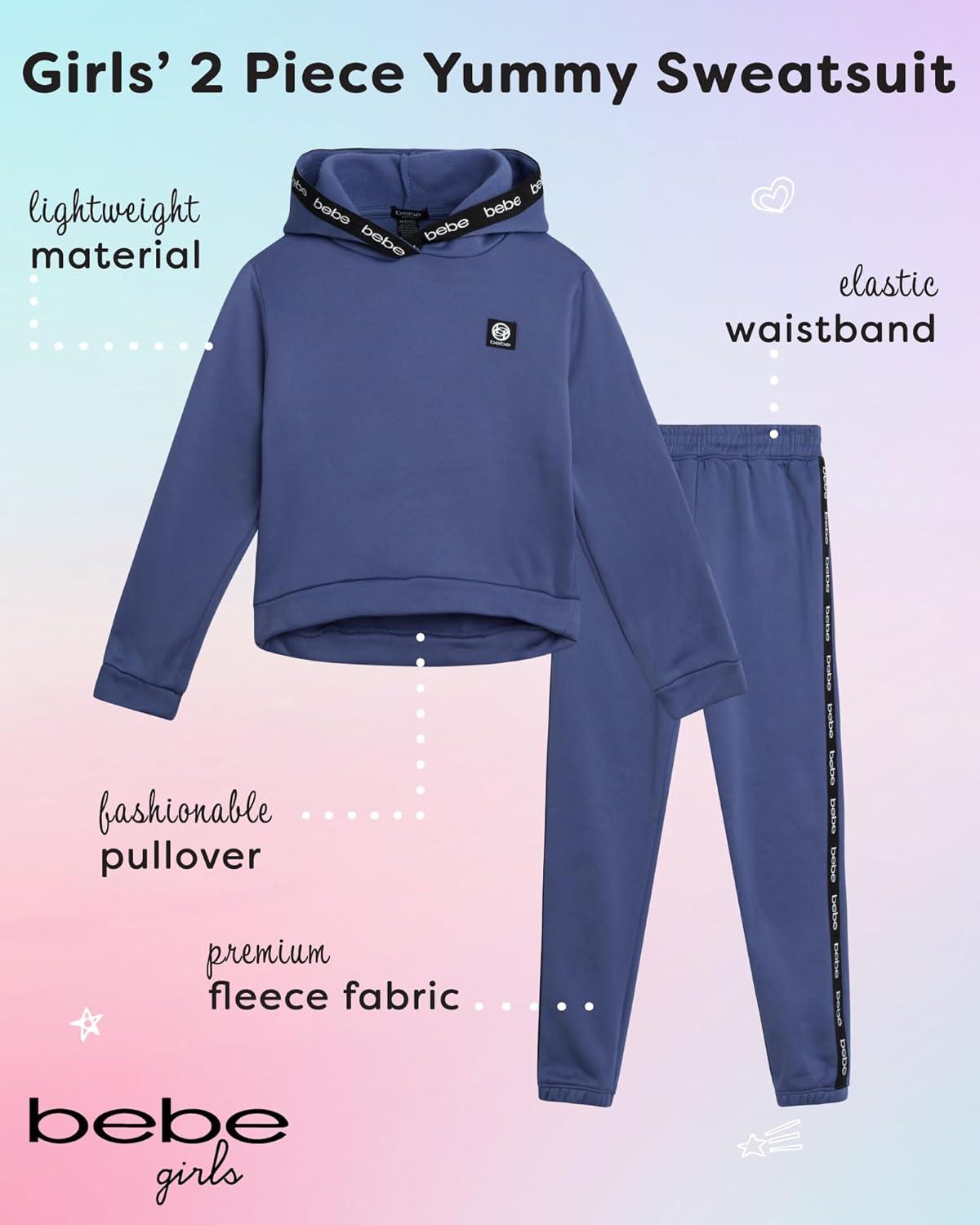 Bring a burst of fun, comfort, and fashion-forward flair to her wardrobe with the bebe Girls 2 Piece Yummy Cotton Blend Fleece Hoodie and Jogger Sweatpants Set-a stylish essential designed for girls who love to move with confidence. This isn't just another girls jogger set-it's a mix of cozy comfort and trendsetting design that makes every day feel runway-ready. Whether she's heading to school, chilling with friends, or out for family adventures, this sweat set for girls keeps her effortlessly put-together. Crafted from a soft, durable cotton blend fleece, this sweatshirt and sweatpants set feels smooth on the outside and comfortably plush inside. The pu.llover hoodie features signature bebe logo detailing and a modern fit that pairs perfectly with the tapered joggers. With its stretchy waistband and cuffed hems, the hoodie sweatpants set gives her room to move. As part of the clothing for teen girls collection, this girls tracksuit set offers a balance of comfort and attitude. Whether she's into athleisure or streetwear, this sweatpants and hoodie set blends both worlds-making it one of the most cute outfits for teen girls this season. It's designed to keep up with her active lifestyle, from morning classes to weekend hangouts. The girls sweatsuit set also delivers versatility. She can wear the full two piece sweatsuit for a coordinated look or mix each piece with other wardrobe favorites. From a pink sweatsuit kids style to neutral shades, this girls sweat outfit adds a playful pop of energy to any closet. Perfect for fall and beyond, it transitions seamlessly between sweatpants and sweatshirts weather to cooler days that call for cozy sweatsuits for girls. When it comes to matching hoodie and sweatpants comfort, bebe does it right-creating girls sweatsuits that look as good as they feel. Designed for movement, made for confidence, and styled for everyday fun, this sweatpants and sweatshirt set is the ultimate expression of sporty chic fashion.