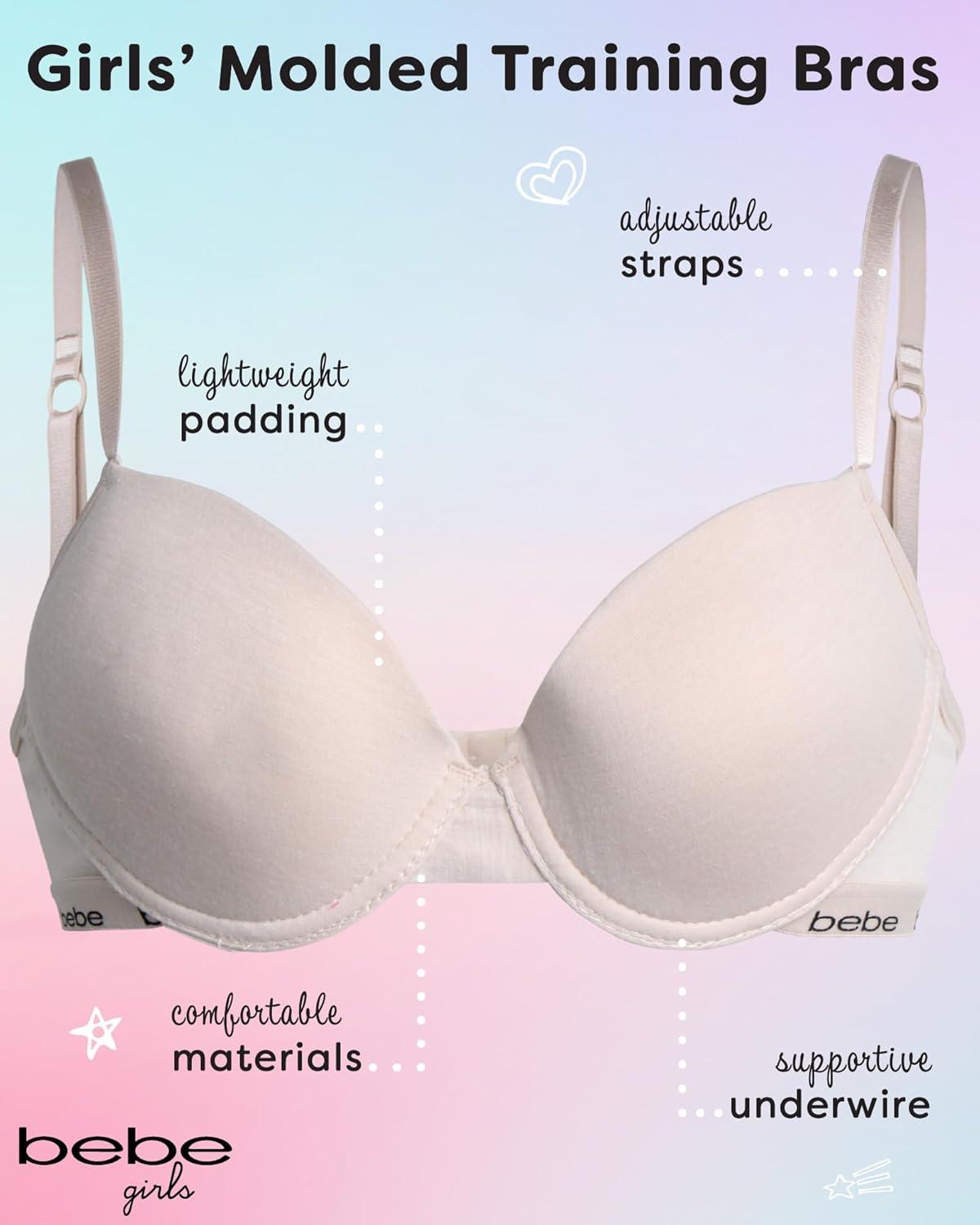 Introducing the bebe Girls' Molded Training Bra, a tailored undergarment designed for girls, teens to their first underwire bra. With a focus on providing unparalleled comfort and essential support, this training bra boasts adjustable straps and a molded design, ensuring a snug and modest fit throughout the day. Offering a modern undergarment experience, it caters to the unique needs of young wearers, guaranteeing a comfortable and confident fit. This beginner bra prioritizes comfort and support, allowing wearers to feel at ease while adjusting to their new underwire experience. A perfect combination of modern design and essential features, this training bra ensures wearers feel both supported and comfortable as they step into the world of underwire bras.
