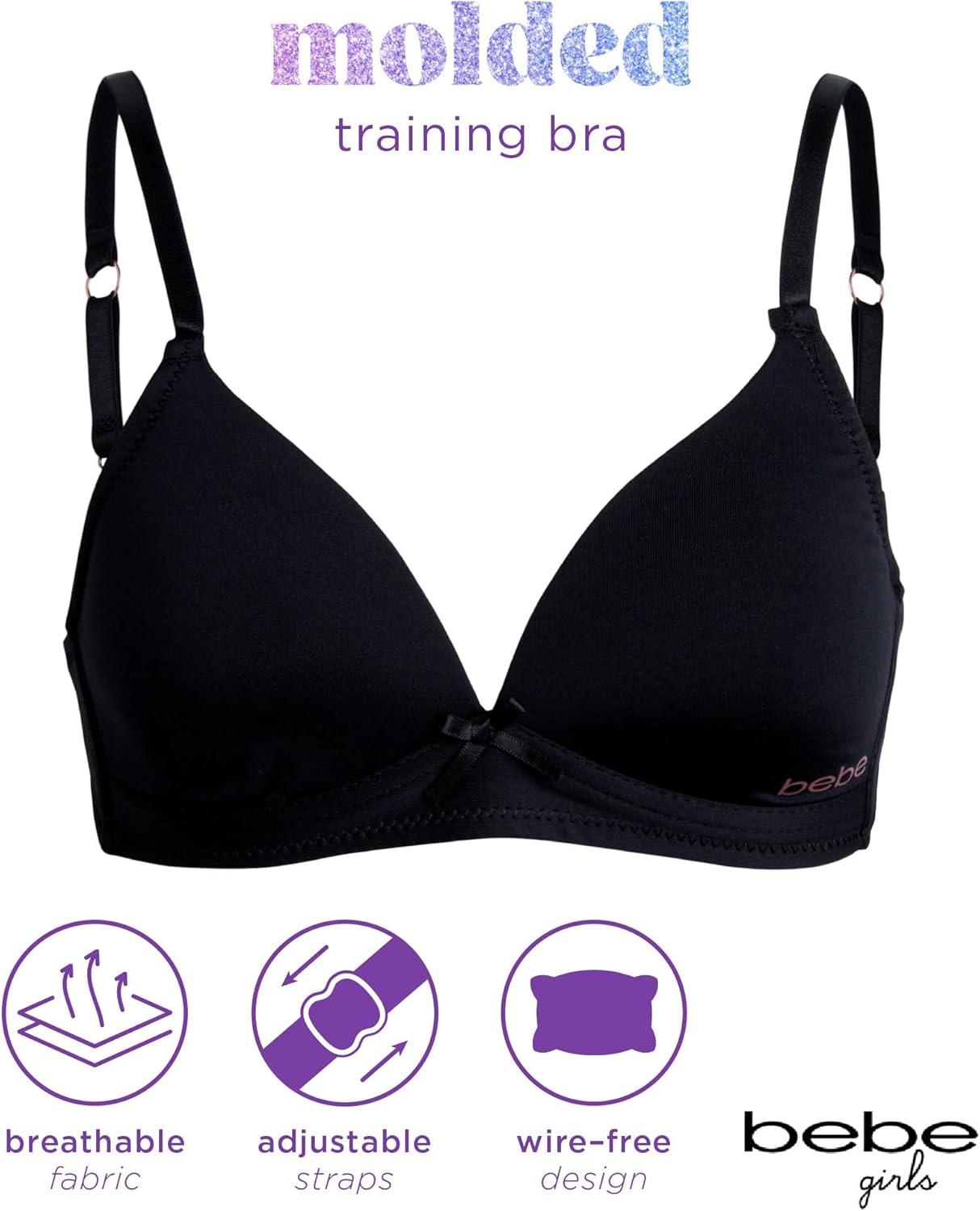 Finding the right training bra for girls shouldn't be complicated. With bebe's wire-free, molded bralette, your daughter gets the comfort, coverage, and flexibility she needs-all without the discomfort of wires or bulky padding. Made from soft microfiber fabric, these bras for teens feel lightweight and smooth against the skin, ensuring a barely-there fit that works under any outfit. Designed to keep up with her active lifestyle, this seamless training bra offers gentle support while allowing her to move freely. The molded, wire-free design provides a natural shape, while the stretchy fabric adapts to her changing body. Whether she's heading to school, practicing her favorite sport, or just relaxing at home, this teen bra ensures all-day comfort without restriction. One of the standout features of this girls training bra is the adjustable spaghetti straps, allowing her to find a custom fit that stays in place. No more annoying slipping or uncomfortable digging-just a flexible design that moves with her. The elastic band provides a snug yet breathable fit, making it an essential part of her daily wardrobe. This 3-pack multipack offers the convenience of always having a fresh, comfortable bra on hand. Great for layering under t-shirts, dresses, and school uniforms, these teen bras provide light support and coverage without unnecessary bulk. Thoughtfully designed for growing girls, bebe's signature style combines fashion with function-so she can feel confident and comfortable wherever she goes. Give her a seamless start with a training bra that feels as good as it looks. Supportive, soft, and easy to wear, bebe's bras for teens are the great choice for her first step into everyday essentials.