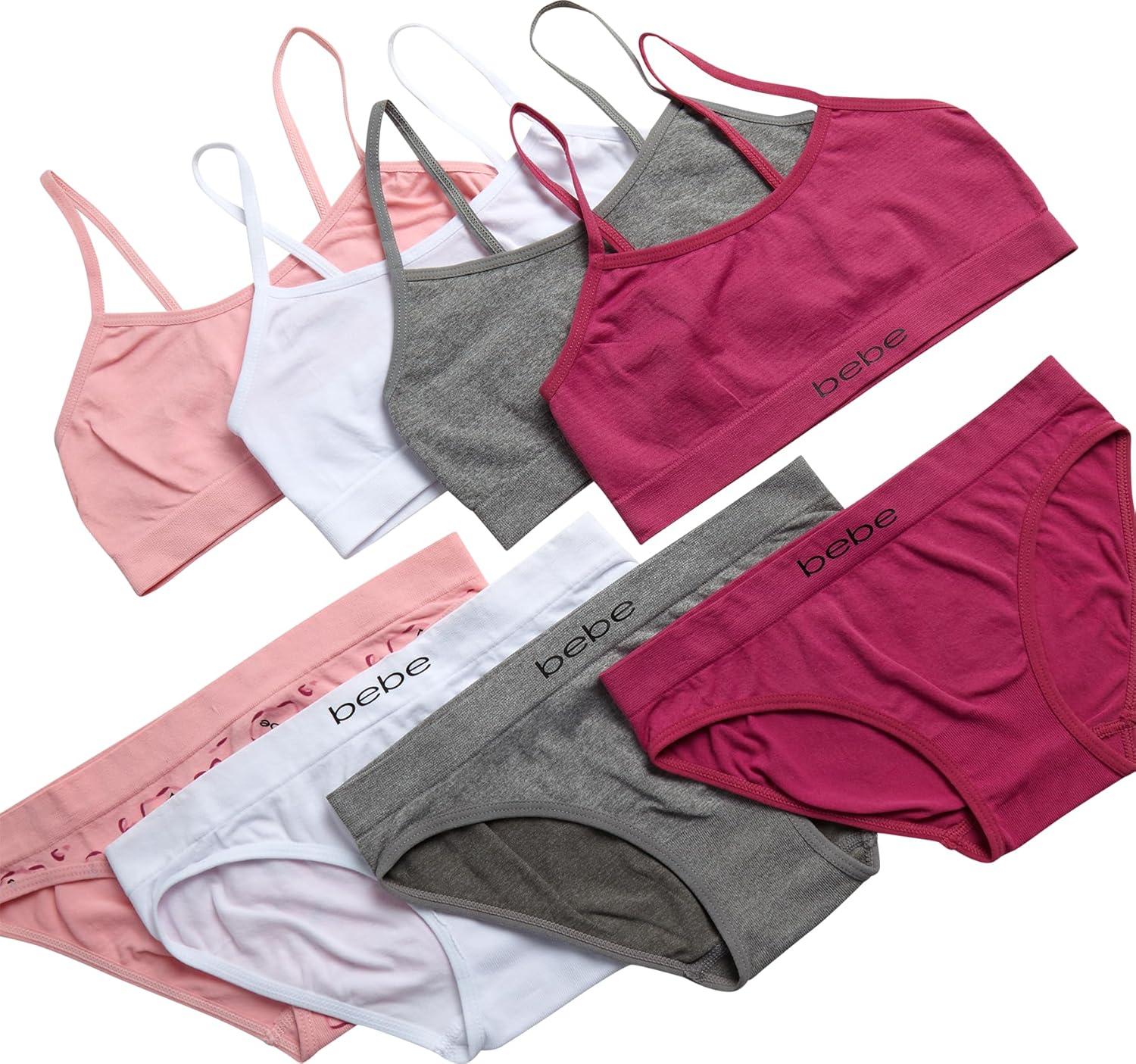 bebe Girls’ Underwear Set – Seamless Cami Training Bra and Matching Panties (8 Piece)(Almond/White/Light Perri/Navy)