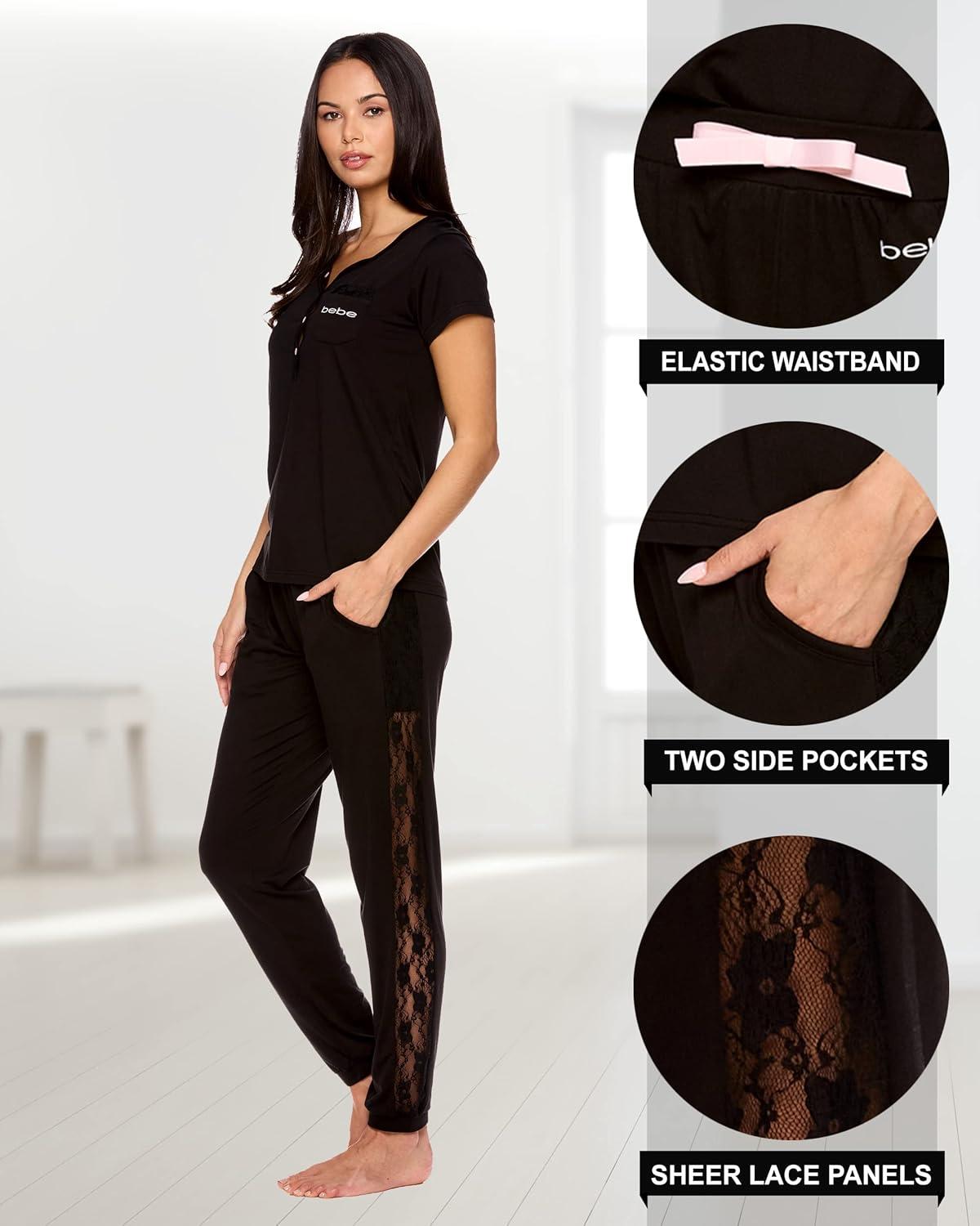 bebe Womens Pajama Set, Short Sleeve Shirt with Lace Jogger PJ Pants Lounge Sets for Women(Black)